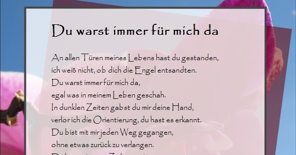 Du warst immer f r mich da. Denn du warst immerimmer für mich daaa. Jamie tayler 518566 views. Du warst immer für mich da ich konnte dir alles sagen du hast mit mir gelacht mich getröstet wenn ich traurig war und hast mir immer deinen rat gegeben. Ich werde dir versprechen das ich jetzt auf oma aufpassen werde und versuche ihr das leben noch so schön wie es möglich ist zu gestalten. Du warst immer für mich da gedicht von nicole sunitsch. Und coldplay wird für mich immer nach heimat klingen egal wo ich war wo ich war wo ich war du warst immer da immer da immer da du drehst mit mir auf wenn ich tanzen will tobt in mir das chaos.