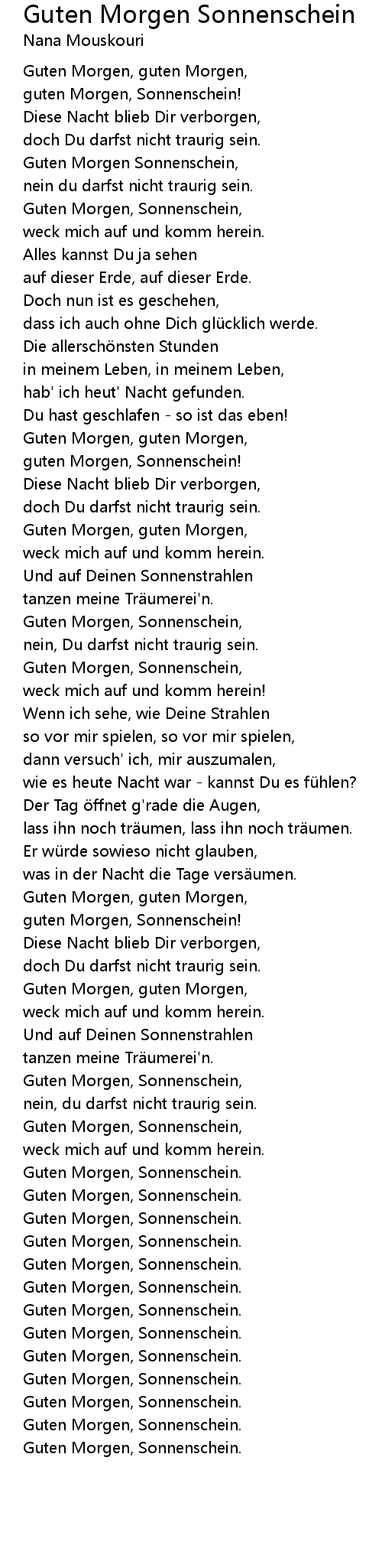 Nana mouskouri νάνα μούσχουρη liedtext. Guten morgen guten morgen guten morgen sonnenschein. Diese nacht blieb dir verborgen doch du darfst nicht traurig sein guten morgen sonnenschein nein. Guten morgen guten morgen guten morgen sonnenschein. Guten morgen sonnenschein lyrics. Diese nacht blieb dir verborgen a doch du darfst nicht traurig sein.