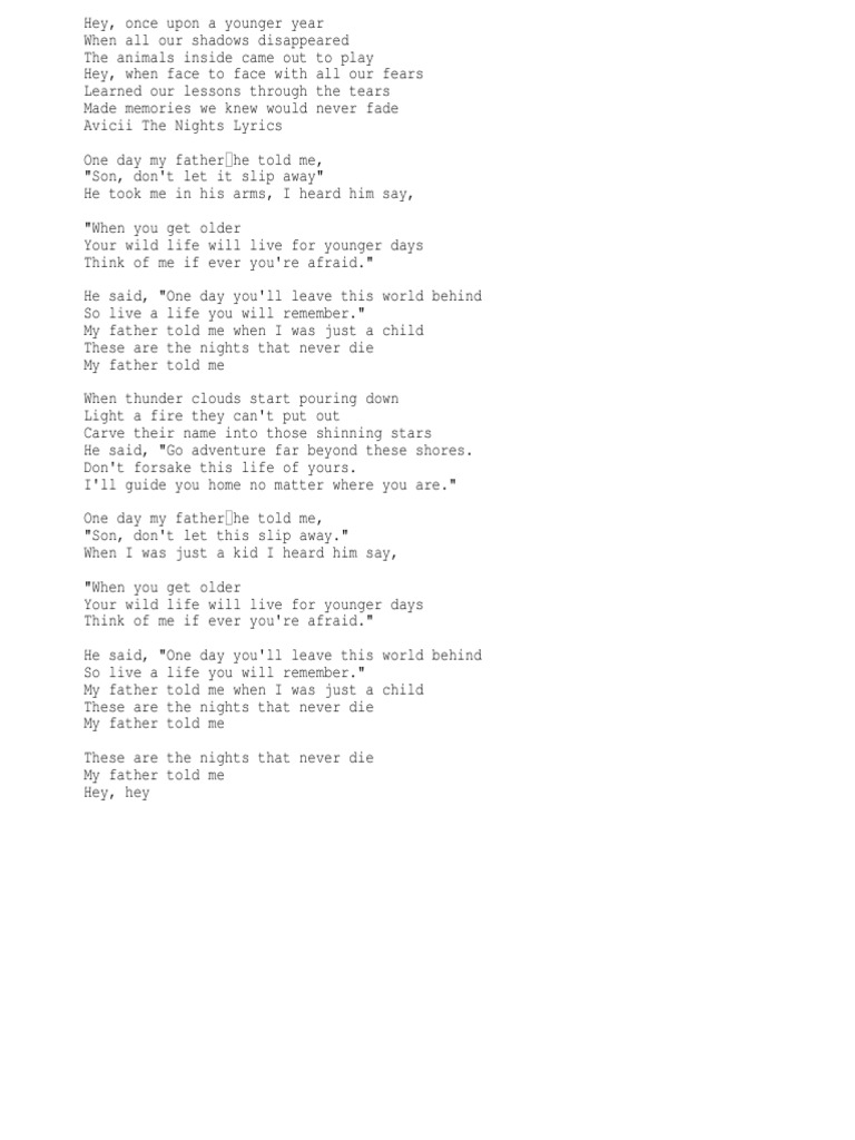 One day you ll leave this world behind so live a life you will remember. Capo 6 verse 1 am hey once upon a younger year when all our shadows disappeared g am the animals inside came out to play hey when face to face with all our fears learned our lessons through the tears g am make memories we knew would never fade f one day my father he told me c son dont let this slip away g am he took me in his arms i heard him say f when you get older c your wild heart. Posted by 19 days ago. One day youll leave this world behind so live a life you will remember my father told me when i was just a child these are the nights that never die my father told me. One day my fatherhe told me son dont let it slip away he took me in his arms i heard him say when you get older your wild heart will live for younger days think of me if ever youre afraid he said one day youll leave this world behind so live a life you will remember my father told me when i was just a child. The world lost a wonderful wonderful human being. One day my fatherhe told me son dont let it slip away he took me in his arms i heard him say when you get older your wild life will live for younger days think of me if ever youre afraid he said one day youll leave this world behind so live a life you will remember my father told me when i was just a child.